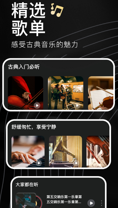 由权威机构推出的官方艺术类应用,专注于古典音乐与高雅艺术传播。平台收录大量交响乐、协奏曲、室内乐等经典作品,同时引入全球新锐作曲家创作成果。提供高清音源与演出视频资源,支持在线学习音乐课程,深入了解艺术背景知识。适合追求文化品位与深度聆听体验的用户长期使用。
