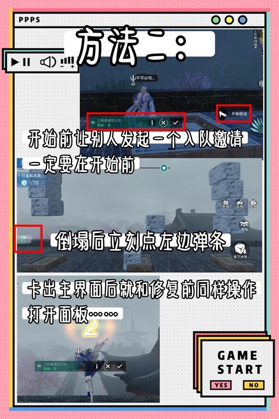 ②先让别人发起邀你入队,不要点弹条。一定要先发起邀请,再开始游戏,否则会锁定目标邀请不了。这个方法可以调出游戏主界面,后面想怎么操作都行,刷排行榜卡城外等