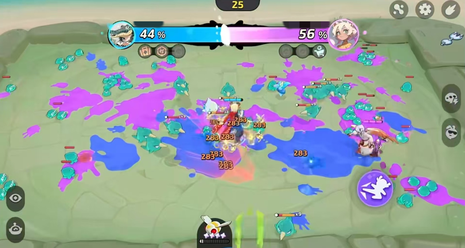 游戏的核心机制别具一格,胜负由涂色区域占比决定。玩家通过击败敌人逐步扩展己方颜色覆盖范围,取代传统血条比拼模式,带来全新的对抗逻辑。武器获取采用创新的血量排序分配机制:系统依据玩家当前生命值高低进行排名,并据此发放装备,玩家需使用钩子主动抓取所分配的武器,这一设计显著提升了资源争夺的策略深度。游戏融合了涂色竞技、弹幕闪避、Roguelike成长三大元素,玩家不仅要在密集弹幕中精准走位,还需在随机生成的武器与科技强化中构建专属流派,在操作挑战与战术构筑之间实现平衡。