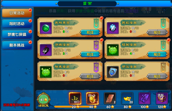 每日的江湖历练是必做内容,任务类型丰富多样,涵盖击败指定敌人、收集特殊物品、护送 NPC 等。任务难度越高,完成后的奖励越丰厚,建议玩家在能力范围内优先选择高难度任务,以最大化收益。这些奖励不仅包括经验,还可能包含装备材料、金币等关键资源,对前期发育至关重要。