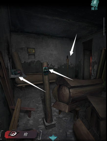2、通风口处移动香包,获得村长的人偶,根据村长手上的三个符号颜色位置的信息把中间的面具点击成正确的图案,获得碎片和菊的人偶,使用湿布把火把熄灭,使用碎片划开火把,获得闪光子弹。
