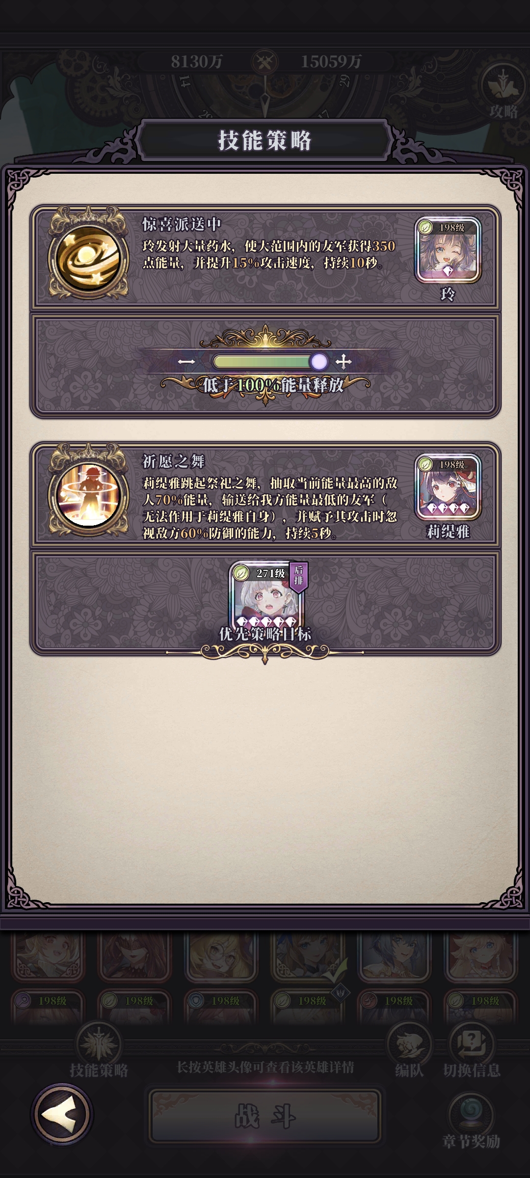 ②针对对方主c:巫女的技能可以抽取敌方单位的能量,要注意这个目标是可以开局在左下角的对战策略中进行调整的,很多时候然后能够抽空一次对方主c的能量,图推过去了,巫女推荐佩戴凡人的斗志魂石。