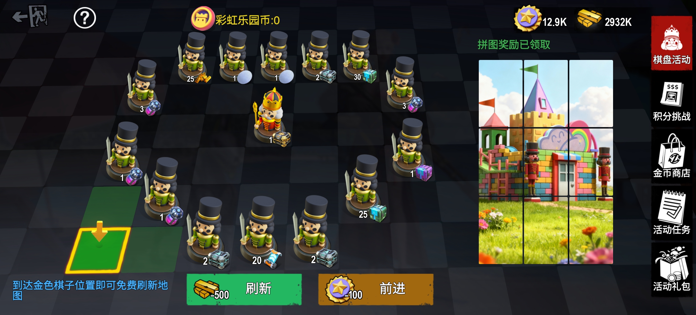 活动期间开启棋盘玩法,消耗100徽章可行动一格,遇到棋子可获得其下奖励,到达国王棋子位置可拿到本层大奖并可免费刷新本层。获得棋子下奖励同时,还可额外获得100玩偶币,用于本期挑战活动。棋盘不会自动刷新,若没到达国王位置可使用金币直接刷新,随着刷新次数增加金币消耗量也增长,每天8点重置金币消耗数量。