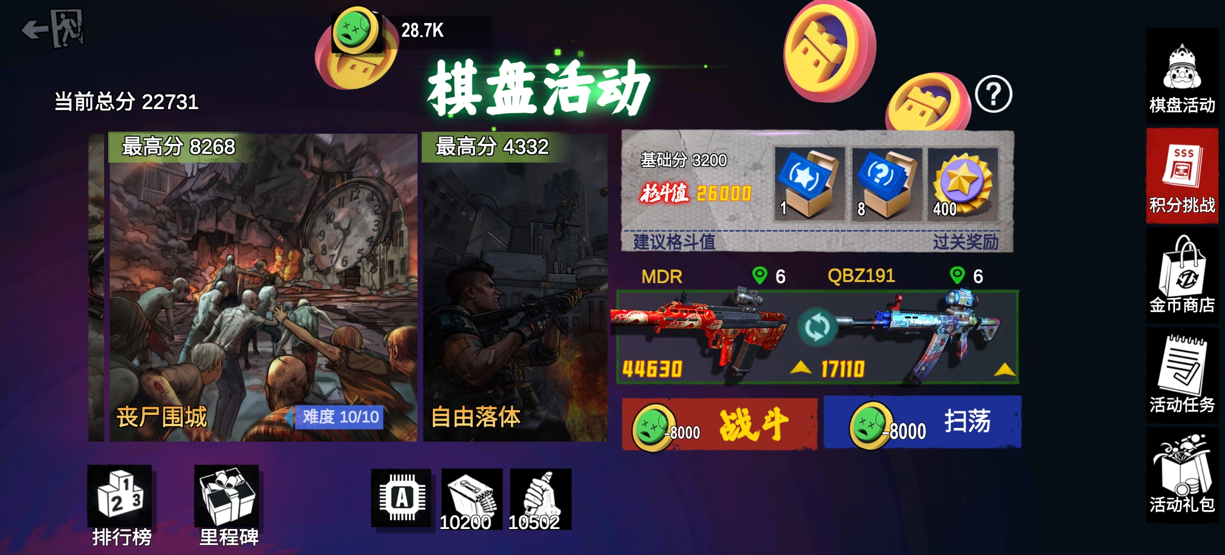4、生死狙击,狙击枪玩法活动,击杀空中蝙蝠和地面僵尸均可得分,但分差较大,推荐优先击杀蝙蝠,仅可使用狙击枪参与战斗,推荐道具是红外线仪和子弹箱。