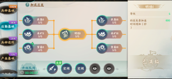 Ps:科技的“兵种基础”升级到一定程度后,会开启“后勤基础”,开启后勤科技后先不要按照顺序升级满兵种基础的科技,建议优先选择升级:神速I,神速ll,明悟l,尤其是明悟l(科技免费加速时间增加600秒,也就是有10分钟的免费加速),升级完科技加速后,我们再选择去升级其他科技就可以达到事半功倍的效果。