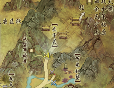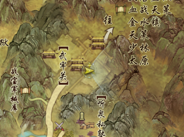 2、然后对话完之后带着她跑出【武牢关】,这里不要用轻功,也不要上马,老老实实走,沿大道走到这个位置,