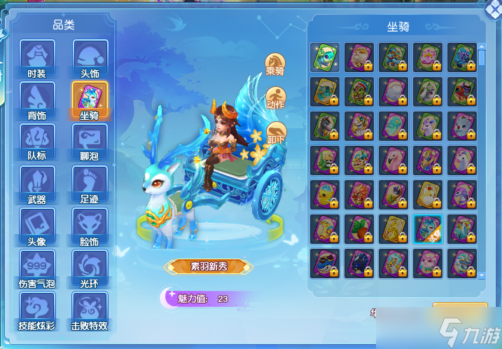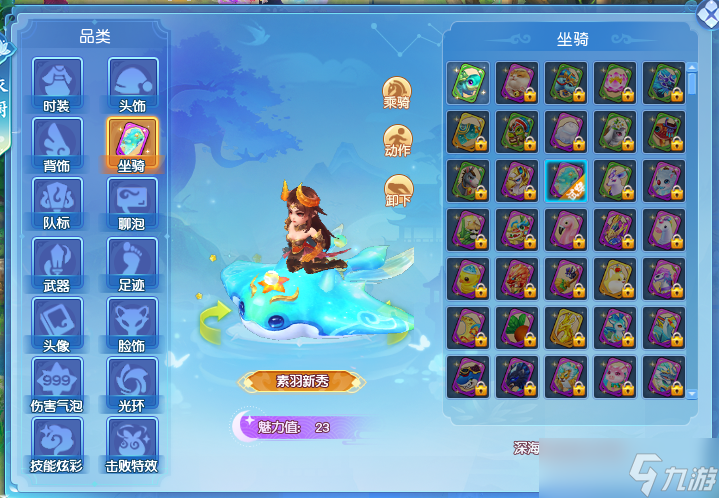 若你心怀一颗少女心或偏爱可爱风格,游戏中众多萌系坐骑定能让你爱不释手。例如这款“碧瑶”坐骑,角色悠然地乘坐在灵兽背部,仿佛正在碧波之上惬意遨游,充满了梦幻与治愈的美感。