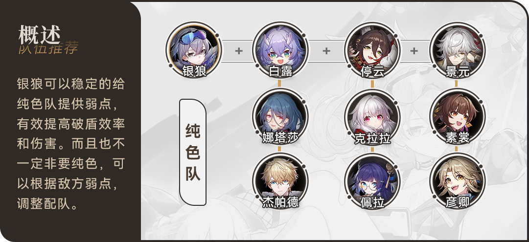 (3)适合加入3缺1的配队(景停白),因为银狼的机制称不上关键,强行融入完整配队会使收益大打折扣