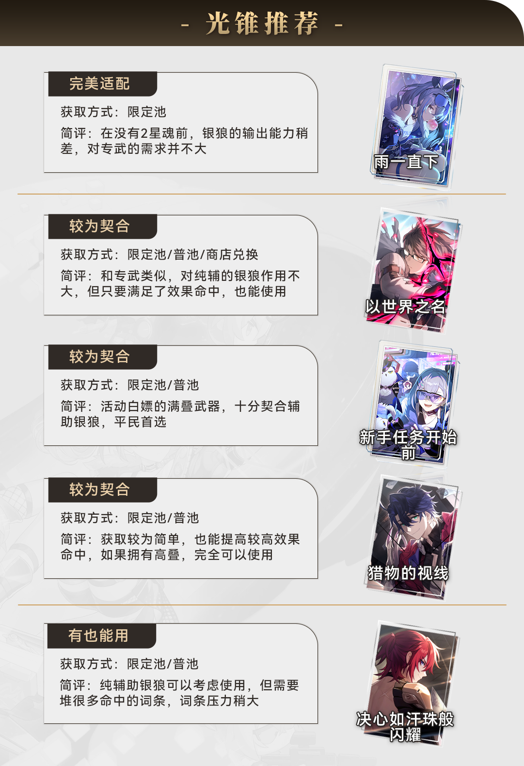 (1)专武【雨一直下】能全方面提升银狼,特效十分不错;在没有二星魂前银狼输出能力稍差,至少一星魂后,才建议抽专武,提升还是很可观的