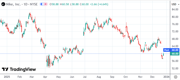 受该消息影响,耐克股价日内一度升至60.58美元,涨幅最大时达到5.6%。截至收盘,耐克涨幅收窄至4.64%报60美元。年初至今,该股已累跌近19%,势将录得连续第四年下跌。
