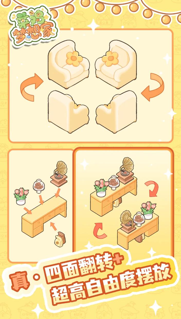 区别于常规装修类游戏,《菜鸡梦想家》彻底取消了网格化布局约束。所有家具支持360度任意旋转、多角度缩放及无边界自由摆放——沙发可斜置窗边,餐桌能置于庭院草坪,甚至可临时移除墙体结构,将室内空间完全向自然延展。这种打破物理限制的设计逻辑,赋予每位玩家真正意义上的“家园主导权”,让理想居所不再受限于模板,而源于个人审美与生活想象。