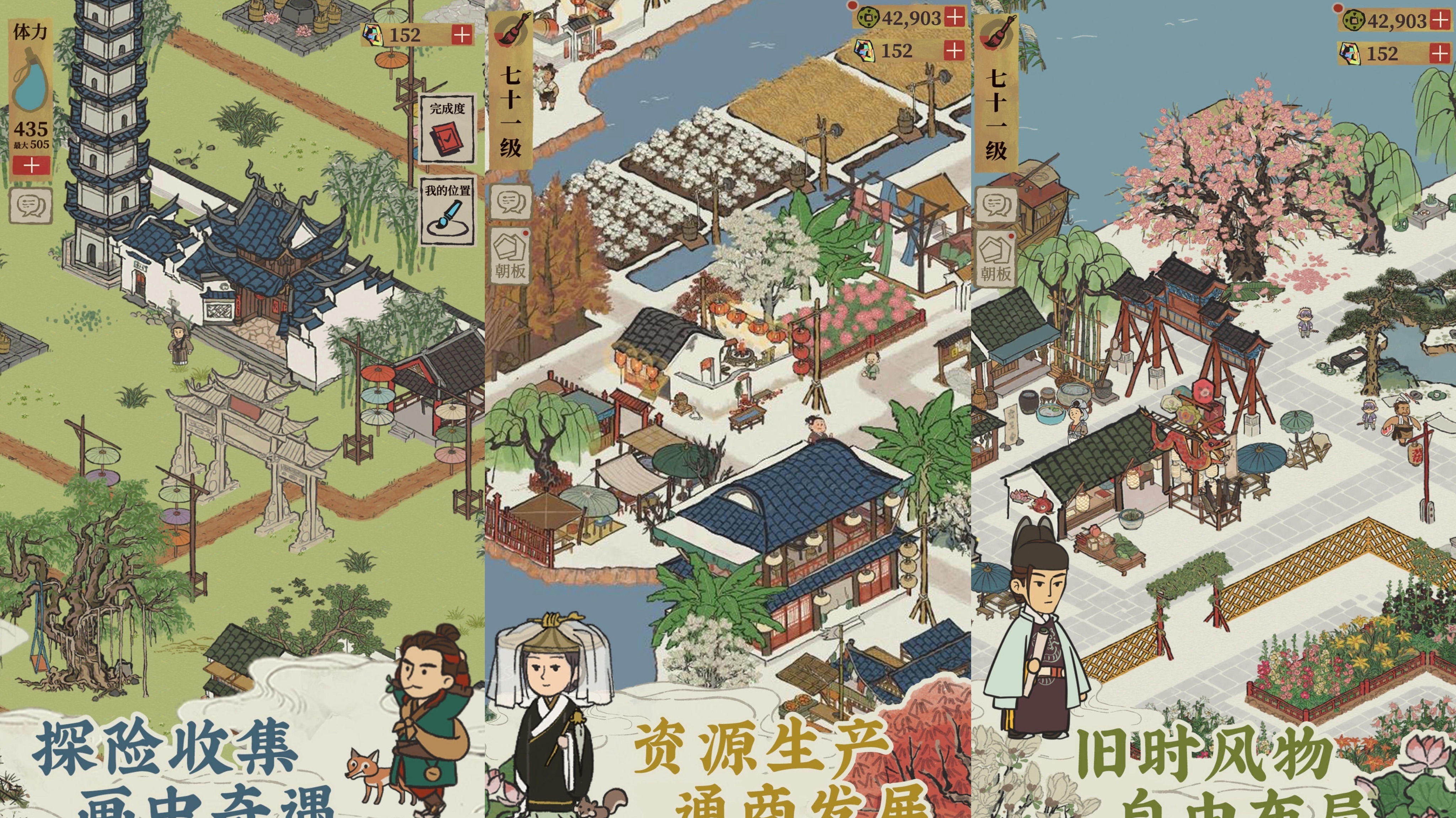 一款古风水墨模拟经营手游,设定于明代江南水乡。玩家担任城市规划者,从断垣残壁起步,逐步修复祠堂、书院、茶肆、织坊等百余种建筑,完善居民生活体系与商业循环。地图采用卷轴式展开结构,随探索进度徐徐铺展,配合四季更迭与节气事件,强化地域文化真实感。建造逻辑尊重传统营造法式,如“前店后坊”“依水成街”,使玩法与美学深度统一。