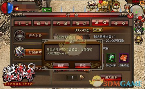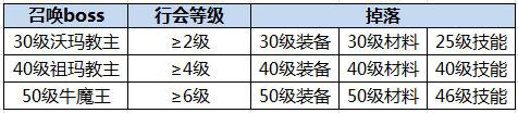 行会的会长和副会长可以在每天16:00-22:00召唤行会boss,本行会兄弟可以在得到提示后进入副本一起击杀boss。行会的等级越高,可召唤出的boss越强悍,掉落的宝物也就越多。在活动时间内,高等级行会可以召唤出更多boss。
