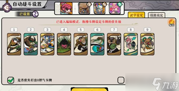 武学卡分别是十面埋伏、灵猴棍法、破天刀法、弹指一刹、烈风斩、独行刀法各两张,其中囊括了8张图系卡和4张风系卡。再来说一下自动战斗设置下的武学设定顺序,破天刀法、烈风斩、剑魔武学、十面埋伏、灵猴棍法、独行刀法、弹指一刹、兔子武学、狮子武学,按照这一自动战斗的武学释放顺序,能够不断压制敌方血量值。