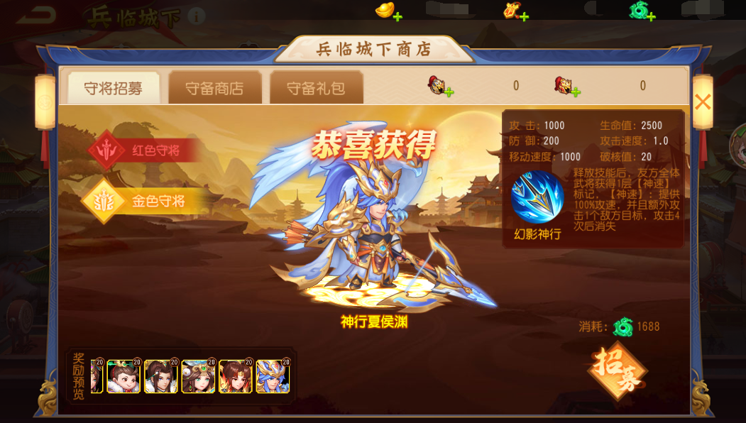 2、在活动的守备商店中,主公可以用【克敌赏牌】兑换各种各样的道具和资源,历代名将、武将皮肤,以及战马界限材料等各种资源等你来拿哟。