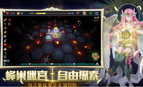 以蜂巢状立体迷宫为舞台,采用程序化生成技术构建高变异性关卡结构。每层区域均存在资源节点、精英守卫点与随机事件触发格,玩家需权衡卡组构筑策略——包括攻击型法术、防御型结界与功能性增益三类卡牌的配比,在有限行动次数内达成最优解。击败首领后将激活宝箱密语系统,输入正确序列可获取稀有遗物。