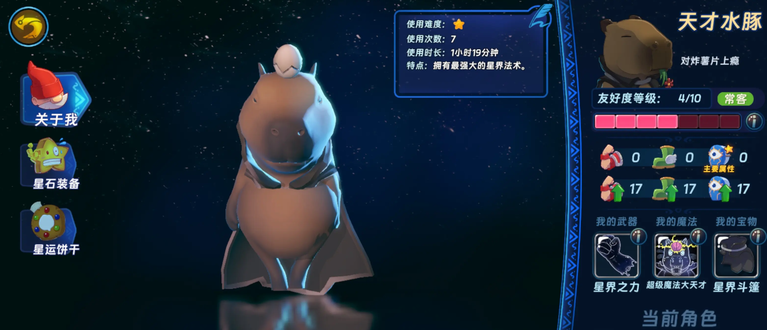 天才水豚的普通攻击是非常厉害的,毕竟他的实力比较强大,自带追踪星芒。激光炮,流星雨这三种星界法术。对于玩家来说,这三种法术在战斗的时候要是轮流触发的话,不仅仅能够达到清小怪的目的。而且在面对比较强大的Boss的时候,它其实也能够合理的运用,就比如激光炮,在战斗的过程当中,手动控轮盘,这样的话就能够朝着敌人的方向释放,才能够有效地精准命中。玩家一旦松开轮盘之后就能够自动锁定目标。所以说大家在养成两次普通攻击之后就能够松轮盘,再普通攻击一次,这样的话就能够让他在战斗的时候输出效率达到更高。