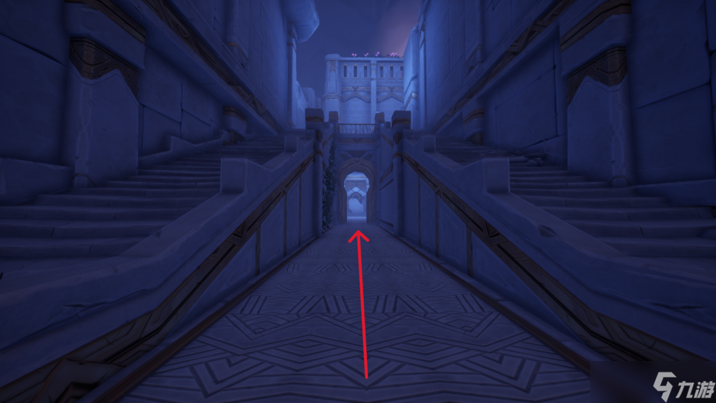 ③ 第二个宝箱位置:需要滑翔机。沿着楼梯上去,经过间歇泉,然后走到栏杆边往下看。下方有带方向指示的图片