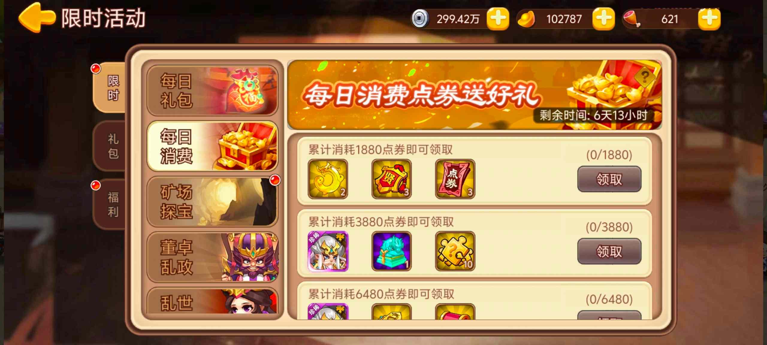 每日消费6480点券:张角·天公碎片*3、龙纹砥*1、特殊材料自选*3