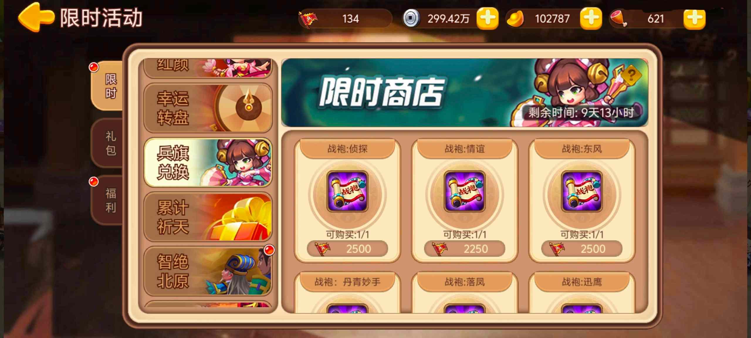 活动内容:活动期间收集兵旗可兑换战袍、武将宝箱等奖励。