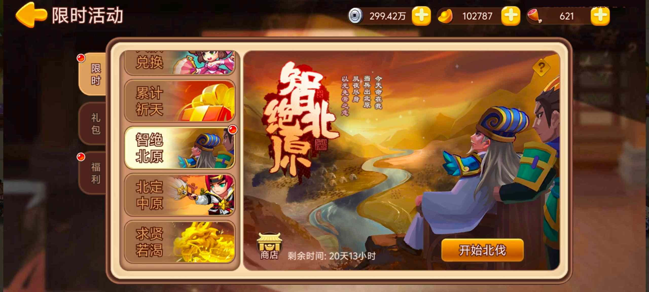 活动内容:活动期间参与北伐活动,击败来袭的敌人,获取粮草可在商店兑换武将及月光套装。