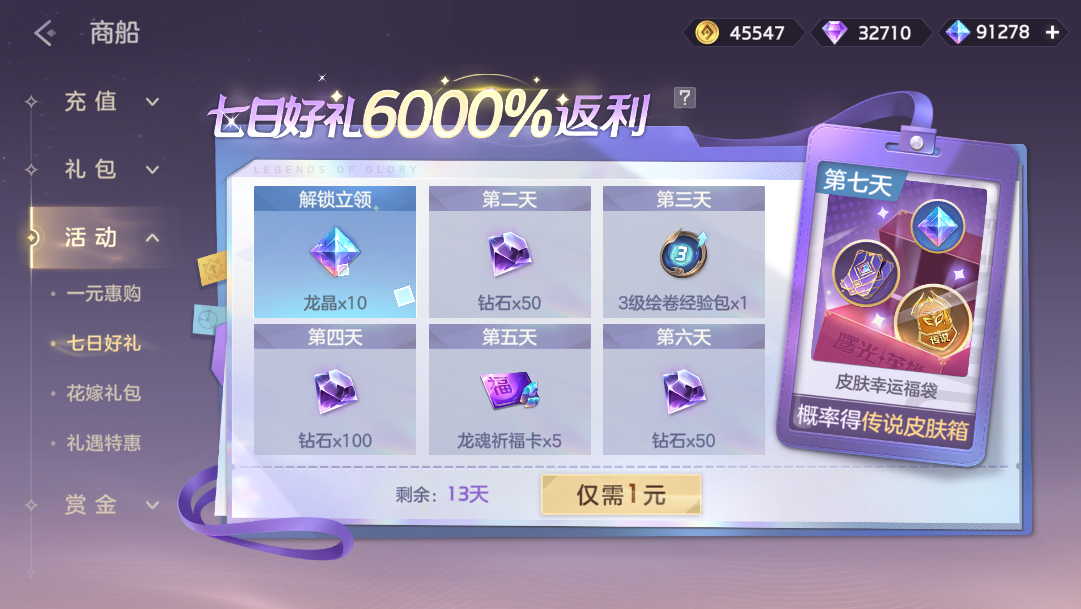 付费1元解锁登录活动,登录游戏即可获得龙晶*10、皮肤幸运福袋(必得皮肤碎片*2、概率额外获得传说皮肤自选箱)、金币奖励,累计登录7天后可得礼券*100。