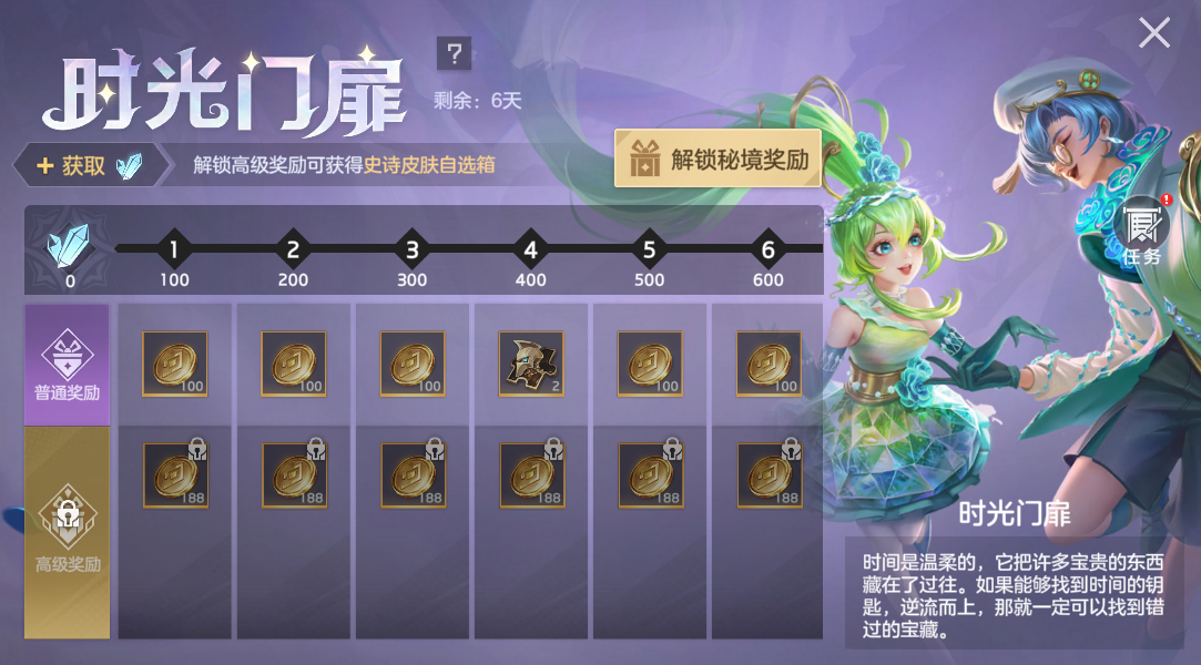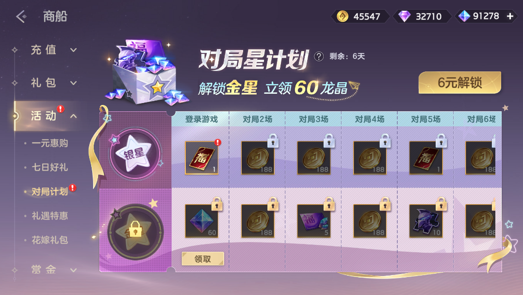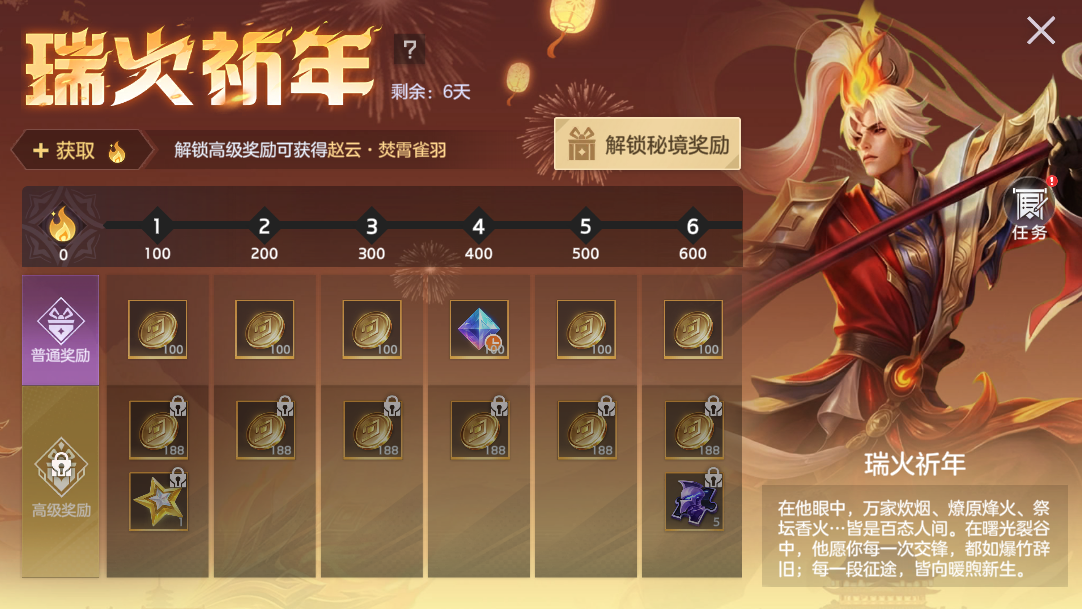 完成对局任务,提升等级免费获取新年福卡、金币,付费6元解锁金星可以获得龙晶*120、龙魂祈福卡、皮肤碎片。
