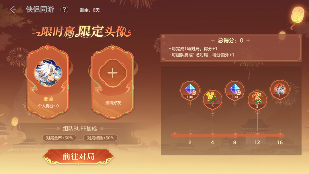 完成对局获得得分,与小队成员共同对局可获得额外得分。根据总得分获得新品限定头像马上暴富、限时龙晶*300、温情之馨、热诚之馨奖励。