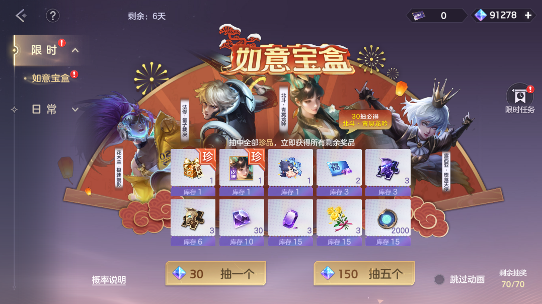 使用宝匣探秘券/龙晶抽奖,珍品奖励宝匣传说皮肤自选箱、新款限定史诗皮肤北斗·青冥龙吟,高级奖励带你飞表情、皮肤碎片、英雄碎片、钻石祈福卡等你来抽!最多30抽必得北斗·青冥龙吟。
