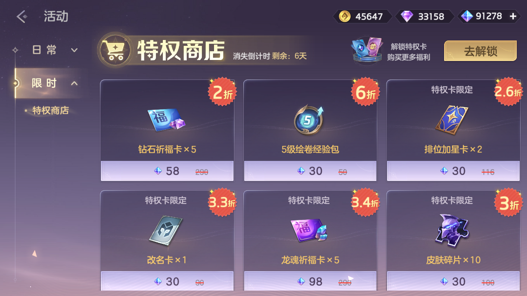 解锁特权卡,享受超值折扣,使用龙晶购买龙魂祈福卡、排位加星卡、皮肤碎片、改名卡等福利。