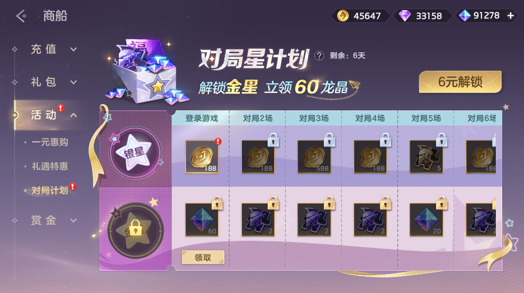 完成对局任务,提升等级免费获取英雄碎片、金币,付费6元解锁金星可以获得龙晶*120、龙魂祈福卡、皮肤碎片。