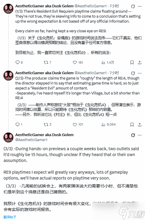 基于现有非官方渠道获取的信息,Dusk Golem判断,生化危机9:安魂曲的主线流程将略长于生化危机:村庄,但稍短于生化危机4重制版。他同时强调,这一判断仅反映当前版本的大致体量趋势,后续仍可能随优化与内容增补发生变动。
