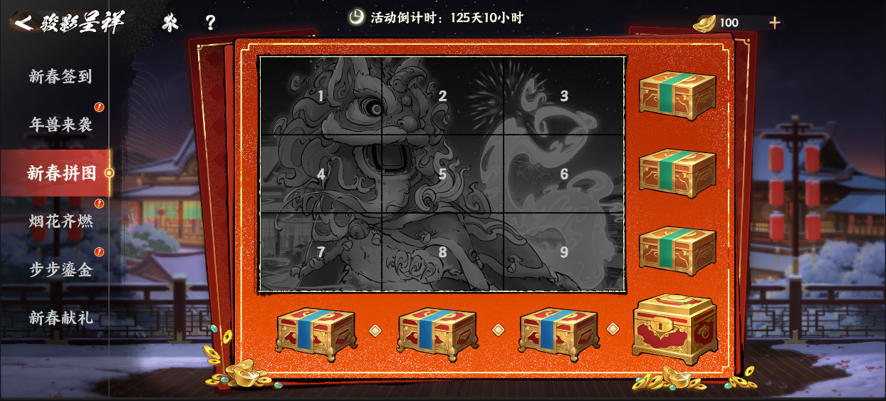 机制:参与年兽、拼图、挂机掉落收集【春节烟花】,将烟花转化为【侠运福钱】。