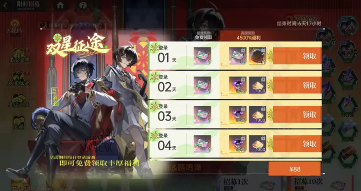 体验活动剧情也可以拿到“星之砂”,完成关卡还可以拿“钻石”、“ur招募卷”等奖励,活动期间每日登录,就可以直接领取到“ur招募卷”,购买可以获得更多助力获取伙伴,此外限定头像框“升变之阶”等待领取。