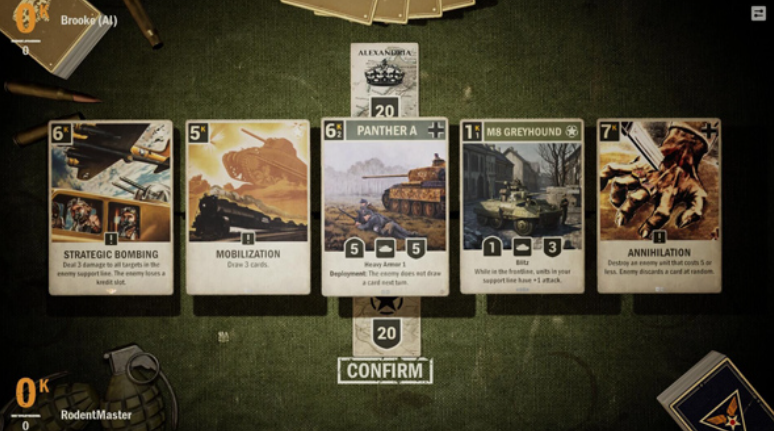 作为一款卡牌型的手游,在策略性这方面的考验自然是比较严格的,玩家们在游戏中将会获得三种卡牌,分别为命令卡,支援卡和单位卡,其中单位卡基本上都是战斗类型的卡牌,各种坦克、飞机、大炮等武器,以及骑兵、士兵等兵种都是包含在内的,而在布局的时候,这些卡牌一般来说是放在前线区,这里也是整场对局中最关键的地方,两方的卡牌将会在这里进行厮杀,后方区域则需要部署支援卡,它们最大的作用就是保证你方的总部不被摧毁。