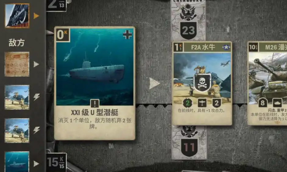 如果说你想让己方的战斗型卡牌发动攻击的话,需要消耗的就是命令卡了,这些通常都是一次性的战术指令,作用也比较丰富,如果说你方的战斗力不太够的话,可以消耗增益类的卡牌为己方的战斗型卡牌增加一定的支援效果,而如果说敌方拥有着很强的防御力的话,有些卡牌则可以用来削弱敌方的防御数值,而每次操作都需要消耗指挥点数,这也是游戏内最重要的资源。