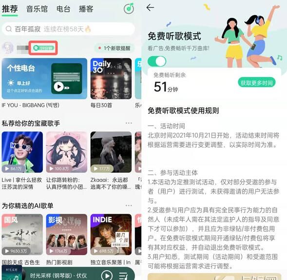 Tips:因为免费听歌时长是以倒计时形式计算,所以使用设备不受限制。
