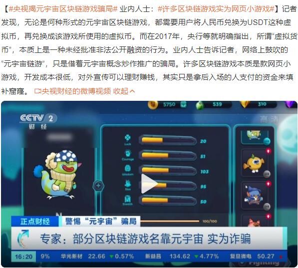 央视记者发现,无论是什么形式的元宇宙区块链游戏,用户都需要将人民币兑换成USDT虚拟货币,然后将其兑换成游戏中使用的虚拟货币。2017年,央行明确指出,所谓虚拟货币本质上是一种未经批准的非法公开融资行为。