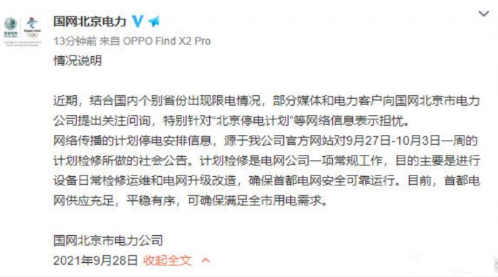 国网北京电力微博发布情况说明称,近期,结合国内个别省份出现限电情况,部分媒体和电力客户向国网北京市电力公司提出关注问询,特别针对“北京停电计划”等网络信息表示担忧。