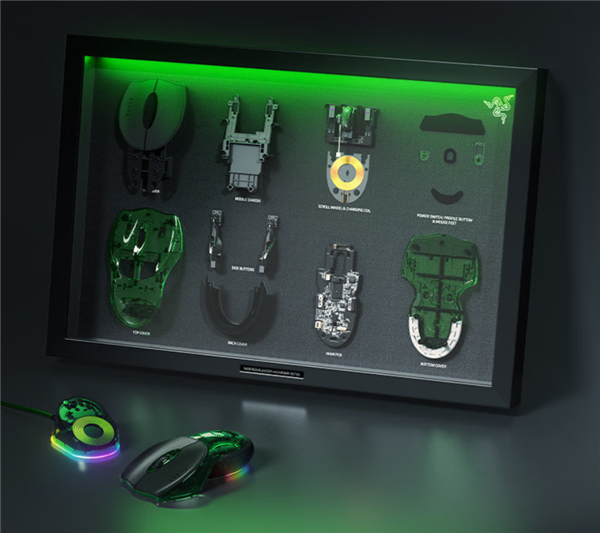 同时,产品还附赠专属典藏LED展示框,可完整展示鼠标内部构造,方便玩家与收藏用户近距离鉴赏细节。