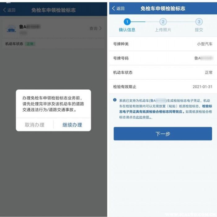 2、提示申领检验标志前,需要处理车辆未处理的违章。点击继续办理,确认信息后,点击下一步;