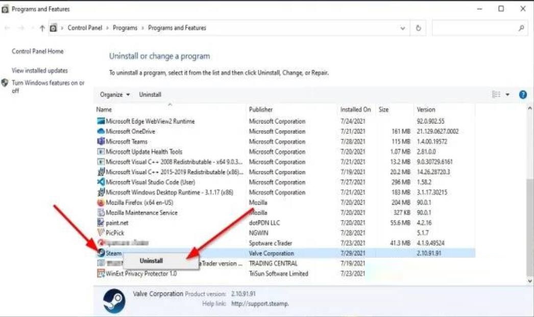 然后右键单击Steam并选择卸载选项。
