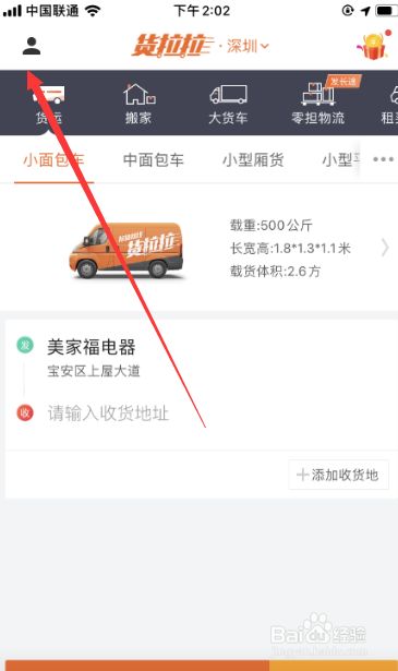 2、进入货拉拉首页后,点击页面左上角的人物图标,如下图红标位置所示。