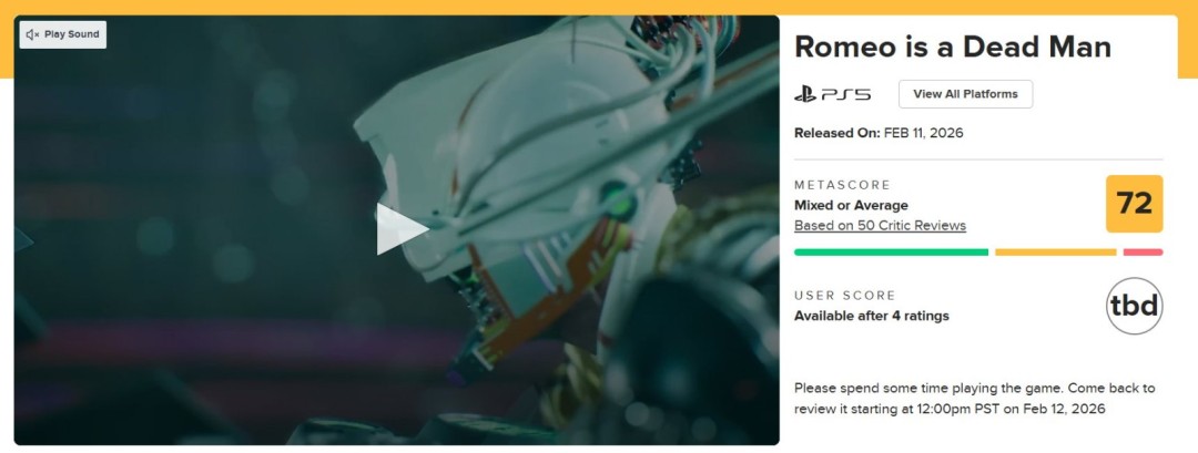 由日本知名游戏制作人须田刚一打造的动作游戏新作《罗密欧是个绝命侠》现已在Steam与主机平台发售,本作的评分也已在游戏评分网站Metacritic上公布。
