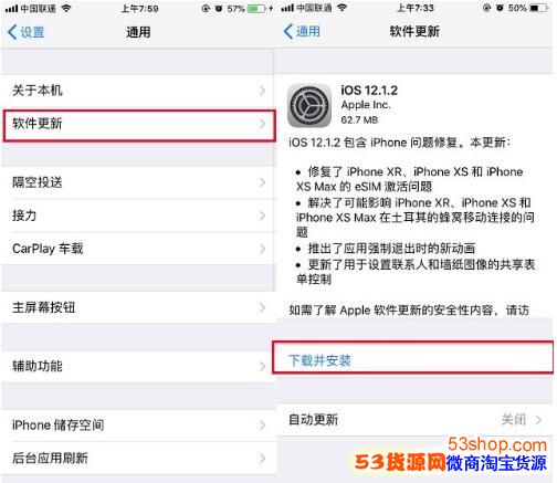 1、首先确保您的设备有足够多的存储空间,电量在50%以上(电量低请在充电下进行),然后连接上WiFi网络(4G不可升级系统),之后依次进入「设置」-> 「通用」-> 「软件更新」,就可以检测到最新版的 iOS12.1.2正式版了,点击下方的「下载并安装」,如下图所示。