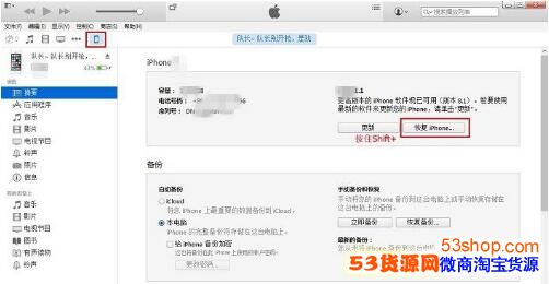 3、然后在桌面端打开最新版iTunes涮机工具,并完成数据备份。之后同时按下“Shift+更新”,选取将要涮入的固件;