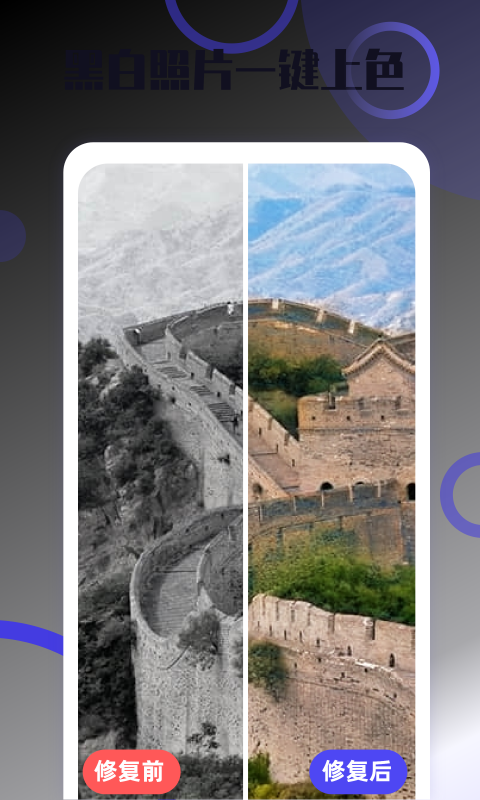 下载不占手机内存,老旧手机也能轻松地承载哦!不管是破损褶皱、模糊雾化,或是整体的分辨率低,该软件都可完美的拯救,修复后能看到脸上的小细节变清楚不少。且给黑白照上色也超准,能很高还原当时的颜色,不会乱上色,很是智能哦。