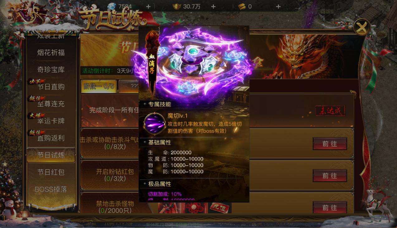 完成指定新春任务,可领取「血滴子」专属技能、「活动抽奖券」、「BOSS复活卷轴·境界」、「充值卡」及限定古宝、百万钻石等丰厚奖励。