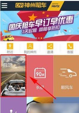 1、安装并打开神州租车,在主界面中根据所需点击租车方式如【自驾】。