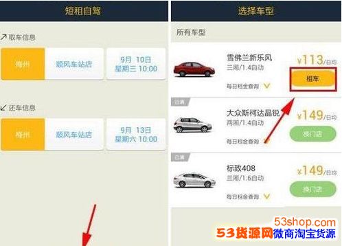 2、输入取/还车信息后点击【去选车】,选择好车型点击【租车】。